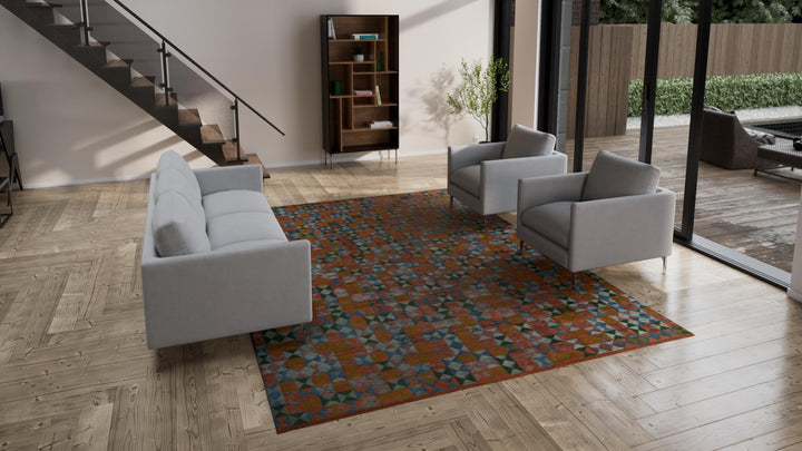 The design presents a repeating pattern, creating a modern mosaic of squares, triangles, and rectangular shapes. A rich palette of vibrant orange, deep blues, forest green, and soft ivory tones provides visual depth. The interplay of colors and shapes contributes to a subtly textured appearance.