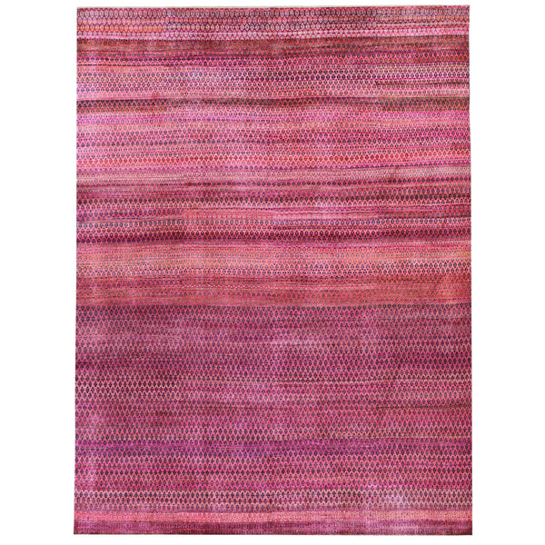 This Purple Alchemy Contemporary Silk Rug measures 9' x 12', offering a substantial foundation for modern interiors. As part of the Alchemy Rug Collection, this hand-knotted piece combines luxurious silk material with a distinctive design. The rug features a dynamic purple color scheme, presented in horizontal bands that transition through various shades of purple, with subtle hints of pink and reddish-brown. This striated pattern provides visual depth. Throughout these bands, a delicate, repeated geometric motif, resembling a fine mesh or...