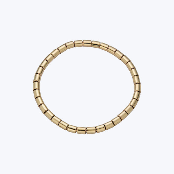 The barrel-bead stretch bracelet in 14K yellow gold is made in Italy and comes with 4 mm beads.