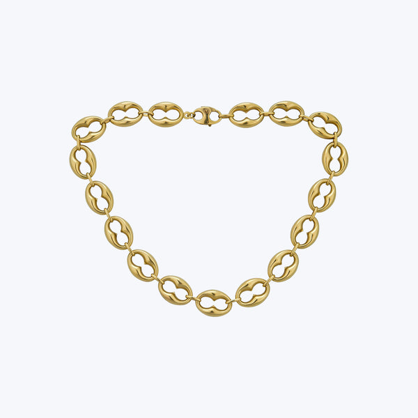 The puffed coffee bean link necklace in 14K yellow gold is made in Italy.