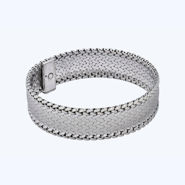 The 18K White Gold Textured Bracelet is a sleek and elegant piece of jewelry crafted from high-quality white gold. The mesh design adds a unique texture to the bracelet, creating a stunning visual effect. This 1960s bracelet is a timeless accessory that will elevate any outfit.