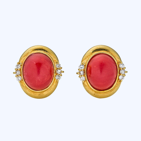 These 18K Yellow Gold, Coral and Diamond Earrings showcase a classic and elegant design. Crafted from high-quality materials, each earring features an oval-shaped red coral gemstone surrounded by small clear diamonds, adding a decorative sparkle. Made from 18K yellow gold, these earrings are perfect for formal occasions.