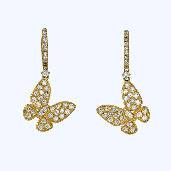 Add a touch of elegance to your ensemble with these 18K Yellow Gold Diamond Butterfly Earrings. Crafted with meticulous attention to detail, these dangle earrings feature a butterfly motif embedded with dazzling siamonds that. The luxurious design exhibits symmetrical and contemporary craftsmanship. Made from 18K yellow gold and adorned with 1.56 ct. of diamonds, these earrings are perfect for any occasion.