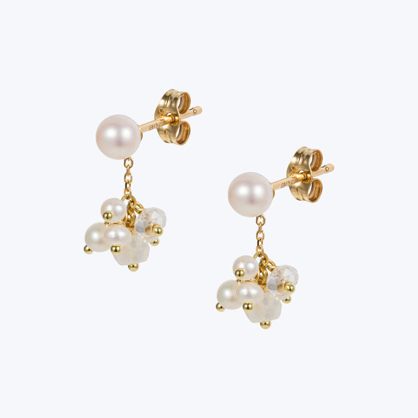 These 18K Gold Pearl Stud Earrings are a stunning addition to any jewelry collection. Made in the United Kingdom, the earrings feature a prominent pearl at the post, with a gold-tone setting. Hanging from each earring are clusters of smaller pearls and translucent faceted stones, arranged in a grape-like cluster. The overall design is elegant, with a soft luster that suggests a refined aesthetic. Crafted from high-quality 18K Yellow Gold, these earrings exude timeless beauty.