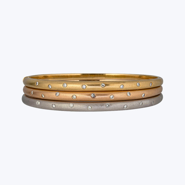 Discover the 18KYWRG Diamond Bangle Trio by abcVintage. This exquisite bangle set features three distinct bands crafted in 18K yellow gold, rose gold, and white gold for an au courant mixed metal look. Each bangle is adorned with round, white diamonds, totaling 0.25 cts. A stunning piece defined by understated sophistication. From the year 2000. Part of the abcVintage Collection, featuring rare pieces sourced from around the globe.