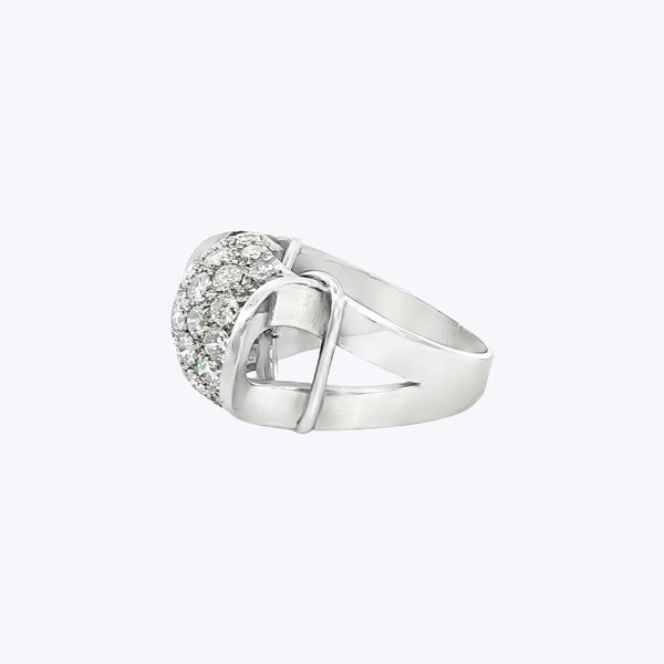 Discover the mid-century glamour of the 1950s Diamond Dome Cocktail Ring in White Gold by abcVintage. Crafted in the 1950s, this striking cocktail ring is both sculptural and radiant—its rounded dome encrusted with 1.17 carats of pavé-set diamonds that catch the light at every angle. An opulent yet refined piece, perfect for the woman who wears boldness with effortless grace. Size 7.