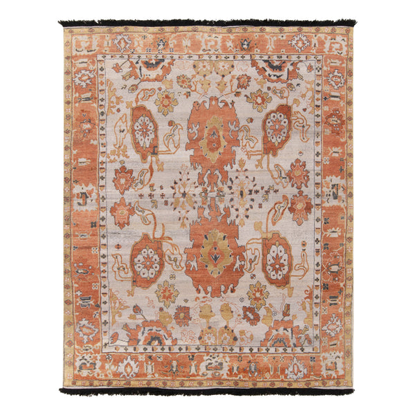 Displaying some of the most important patterns in the history of rug making, this White Traditional Wool Rug - 8'1" x 10'1" marries high fashion with unsung traditional appeal. Hand-knotted from durable wool, this one-of-a-kind rug is filled with rich orange and cream hues melded with highlights of yellow and grey through its distinct Oushak design. Finished with an eye-catching black fringe, this tribal rug is the perfect example of refined sensibilities and traditional oriental grace.