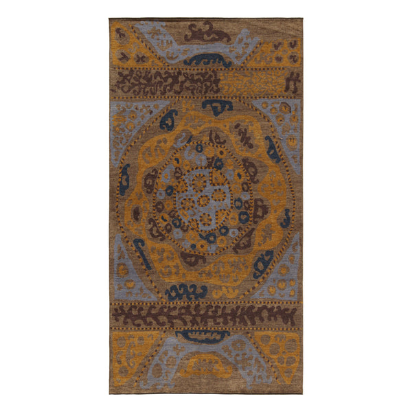 Displaying some of the most important patterns in the history of rug making, this Tribal Style Rug - 5'1" x 9'9" is inspired by antique Persian rugs with rippling colors in asymmetric geometric patterns. Hand-knotted from soft wool, this one-of-a-kind rug is filled with rich colors of blue, gold, and beige-brown. This tribal rug is highly celebrated in nomadic aesthetics, skillfully recaptured in melting hues, refined texture, and gracious scale.