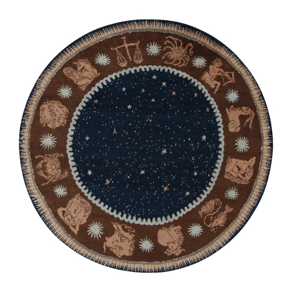 Inspired by Art Deco rugs of the 1920s, this French Deco Style Rug - 8'11" x 8'11" features a central field of stars in navy, gold, and silver surrounded by the astrological zodiac signs for a gentle, yet sophisticated presence. Hand-knotted from wool, this zodiac wheel round rug is an awe-inspiring piece worthy of the center stage in your living room, bedroom, or entryway with its distinguished charm.