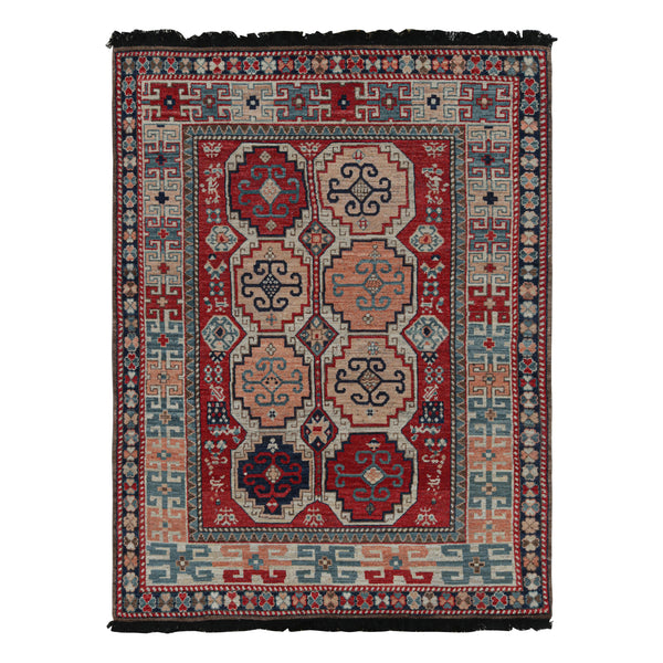 Displaying some of the most important patterns in the history of rug making, this Traditional Wool Rug - 5'5" x 7'2" features a variety of traditional geometric designs in rich red, blue, and cream. Hand-knotted from soft wool and finished with an eye-catching black fringe, this tribal rug is highly celebrated in nomadic aesthetics, skillfully recaptured in melting hues, refined texture, and gracious scale.