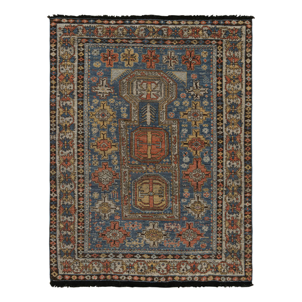 Displaying some of the most important patterns in the history of rug making, this Tribal Style Rug - 5'1" x 6'11" is inspired by antique Persian rugs with rippling colors in balanced geometric designs. Hand-knotted from soft wool, this one-of-a-kind rug is filled with rich colors of blue, orange, and yellow. Finished with an eye-catching black fringe, this tribal rug is highly celebrated in nomadic Khotan aesthetics, skillfully recaptured in melting hues, refined texture, and gracious scale.