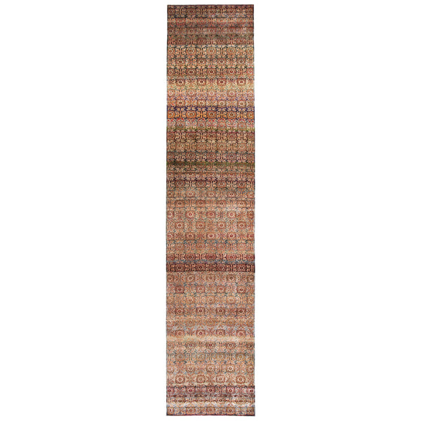 This Multicolored Alchemy Transitional Silk Runner, measuring 3'0" x 18'0", is a piece from the Alchemy Rug Collection. Crafted from silk, this hand-knotted runner originates from India, a region known for its traditional rug-making expertise. The runner features a multicolored palette within a transitional design, which combines classic motifs with a contemporary aesthetic. Its pattern consists of repeating geometric and stylized floral elements arranged in distinct horizontal bands. The color palette includes muted reds, gold, subtle blues, greens, and earthy...