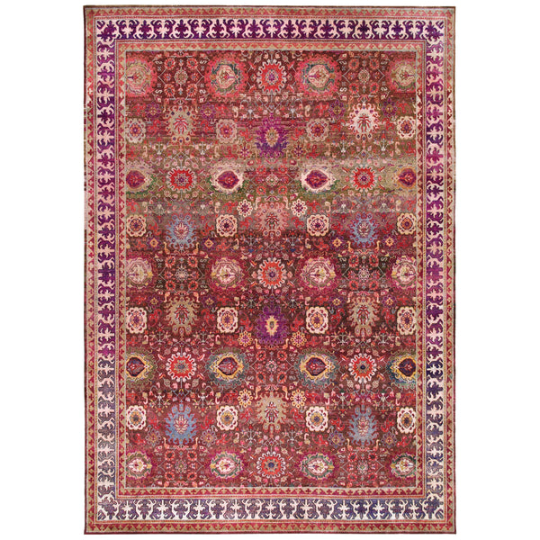 The Pink and Purple Alchemy Transitional Silk Rug is a masterpiece of intricate design featuring floral and geometric motifs in shades of red, blue, and beige. Hand-knotted in India, this 9'8 x 13'11 rug exudes quality and craftsmanship with its rich colors and detailed patterns. Made of luxurious silk, this rug is a stunning addition to any home.