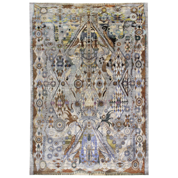 The Grey Alchemy Transitional Silk Rug is a masterpiece of intricate design, hand knotted in India. Featuring a symmetrical blend of geometric and organic shapes in muted tones of blue, brown, beige, and gray. The luxurious silk material and traditional craftsmanship make this 9'8 x 13'8 tapestry a truly exquisite addition to any space.