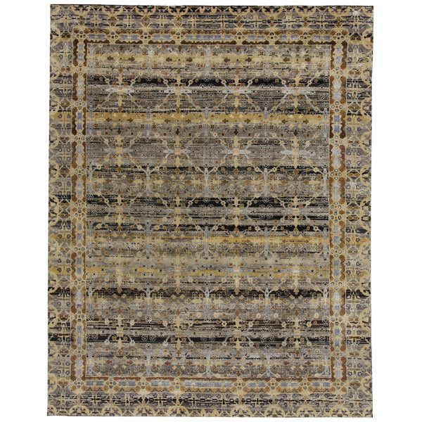 This Grey Alchemy Transitional Silk Wool Blend Rug, measuring 7'11" x 10'4", provides a sophisticated foundation for various interior designs. As part of the Alchemy Rug Collection, this piece merges classic patterns with a contemporary approach, creating a versatile aesthetic suitable for diverse settings. The rug's design features a complex interplay of colors and patterns. While primarily grey, the palette includes multi-tonal shades of charcoal, muted greys, and light silver. These are complemented by interwoven elements of rich gold, black,...