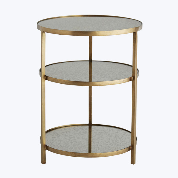This 3-Tier End Table showcases a sturdy round silhouette made from iron with an antique brass finished frame and antiqued mirror shelves. This is the perfect side table to situate next to an accent chair and can hold everything you may need: a lamp magazines notebooks remote controls or a sculpture. A beautiful side table for your living room, bedroom, or entryway. The Arteriors Collection is committed to sustaining, preserving, and protecting at-risk artisan productions and techniques, ensuring they thrive...