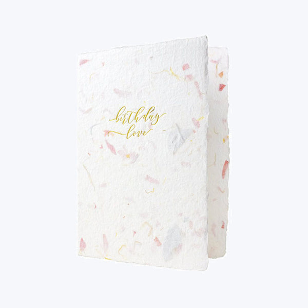 This Pressed Floral Birthday Card carries the essence of a bouquet with flower petals and ferns skillfully enveloped in the fibers of our handmade floral paper. Features ink and gold foil on a letterpress printed folded card on full-deckled floral white handmade paper from 100% recycled cotton, calendula, and dianthus petals and ferns with white envelope. Blank inside with "birthday love" on the exterior. Made in Portland, Oregon.