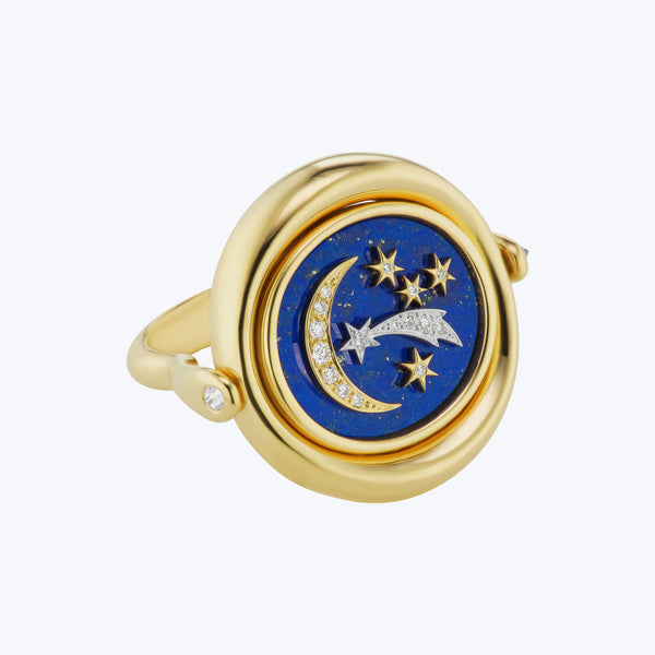 The 4 Elements Air Flip Ring can be worn with either the celestial scene or the quantum interconnectivity of the galaxy facing up. When you pair the ring with a chain and charm holder, the flip ring becomes a pendant! On either side of the ring there is an inverted diamond. The lapis is sustainably minded in Chile and cut in NYC. Ana Katarina believes in the element of air or ether- the black space where all of the Divine's...