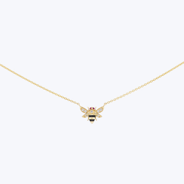 The Bee Charm Necklace is expertly designed and crafted in 18k yellow gold with diamond wings, ruby eyes, and black enamel and gold stripes. The adorable bumblebee totem, an earth sign, represents Taurus, Virgo, and Capricorn.