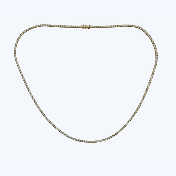 The 18K Yellow Gold Diamond Tennis Necklace is an elegant piece featuring a series of round diamond-encrusted settings linked together to form a secure chain. With a classic and timeless design, it is perfect for both formal and casual occasions. Made from 18K yellow gold with a 7.03 ct. diamond, its quality and beauty are unmatched. This necklace measures 16.5" in length and is a stunning addition to any jewelry collection.