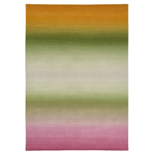 This Multicolored Ombre Striped Rug 6' x 9' features stunning tones of grass green, sunset orange, and soft pinks that lend an abstract sophistication to any room. This modern abstract rug is hand-knotted from wool in Turkey.