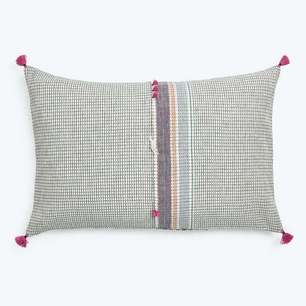 The Ahir Pink Tassel Pillow, measuring 16" x 24", is a striking piece that effortlessly blends modern design with artisan craftsmanship. Made from 100% organic cotton, this oblong cushion features a meticulously woven textile design, with a dense grid of neutral tones creating a richly textured surface. A vertical stripe of pastel and bright hues runs asymmetrically across the pillow, infusing it with a playful yet sophisticated vibrancy. Each corner is adorned with whimsical tassels, adding an element of charm...