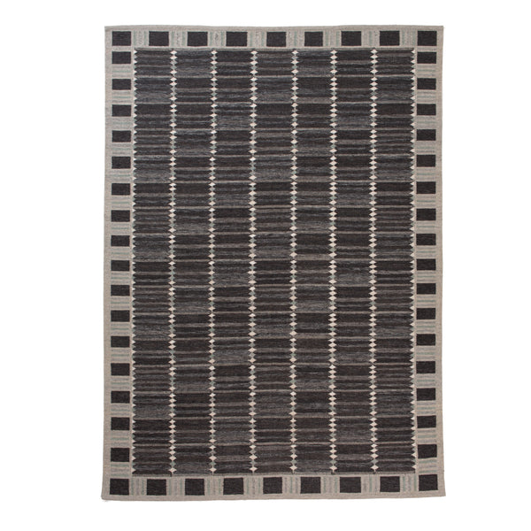 This Ajanabh Modern Swedish Flatweave Rug 10' x 14'' is handwoven from durable wool in India and full of pleasing mid-century modern symmetry that adds movement and dimension to any home. The neutral grey color palette in this Swedish Deco style rug provides a balanced foundation for the crisp geometric pattern. Experience the ultimate versatility and lightweight luxury of this vintage flatweave rug.