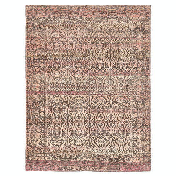 Pink Alchemy Transitional Wool Silk Blend Rug boasts a presence that transforms entire rooms with its scale and design. Measuring 8'11" by 11'10", this rug is more than just a floor covering; it's a statement piece, crafted in India through the skillful art of hand-knotting. The marriage of durable wool with the elegance of recycled sari silk creates a soft, resilient surface that dances with the ambient light, offering a subtle sheen and texture. Diving into its visual symphony, the...