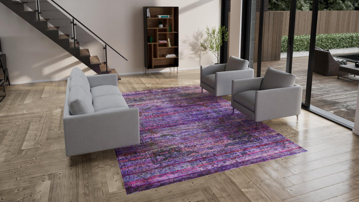Hand-knotted in India from upcycled silk, this Purple Transitional Silk Rug - 8'10" x 12'3" displays a traditional design of an intricate Mughal hunting scene with Indian and Persian elements that emerge from a soothing purple and pink background. A magical marriage of traditional design and modern artisanship, this one-of-a-kind rug is made luminous by sun power, low-impact dye, and closed-loop water washes, an eco-conscious process signature to our Alchemy collection.