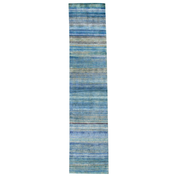 This Blue Alchemy Geometric Silk Rug features a transitional design with a multi-color striped pattern. Measuring 2 feet 11 inches by 14 feet 10 inches, this runner rug offers a distinct visual element for various interior spaces. The rug displays a palette of blues, teals, light greens, and subtle beige tones, arranged in horizontal geometric stripes. These varied hues create a dynamic yet cohesive multi-color effect, suitable for integrating into diverse decor styles. The design provides a modern interpretation of...