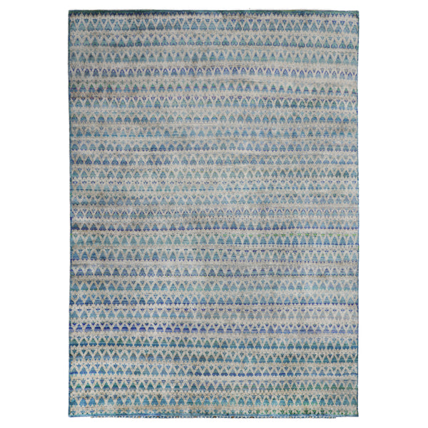 The Aura Alchemy Silk Rug - Jaipur is a distinct piece from the Alchemy Rug Collection. This 6' x 9' rug is crafted from 100% pure silk, offering a soft texture and a natural, subtle sheen that enhances its overall appearance. Originating from India, this rug features a multi-color palette primarily composed of varying shades of blue, teal, and green, set against a light cream or beige background. The design showcases an intricate geometric pattern, formed by repeating small triangular...