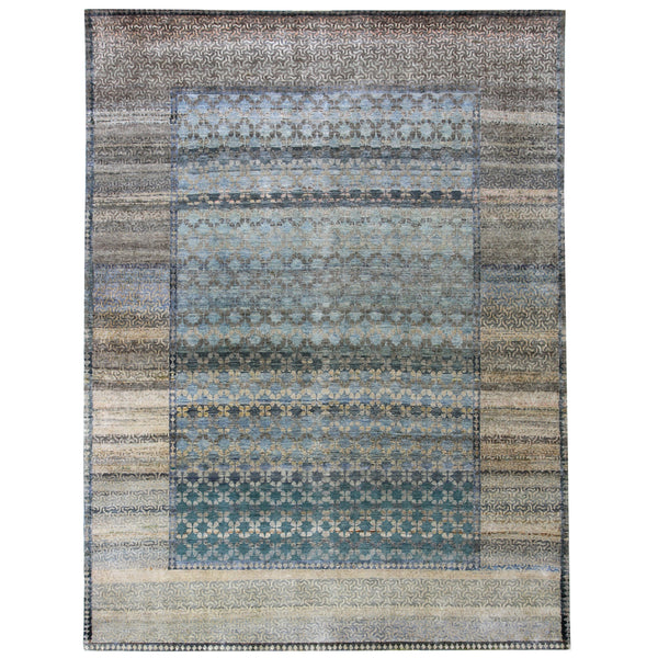 A traditional pattern influenced by Samarkand Khotan motifs and sacred geometry emerges from a distressed bright background thanks to an antique wash in this Blue Transitional Alchemy Silk Rug - 7'9" x 10'3". Handmade in India from upcycled silk, this one-of-a-kind area rug from our Alchemy collection reimagines iconic vintage motifs in a spectrum of neutral blue, grey, tan, and green hues featured here.Soft and shapeshifting, this high-end rug is made luminous by sun power, low-impact dye, and closed-loop water...