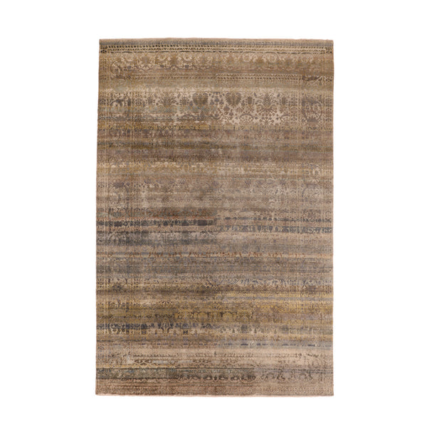 There’s something mesmerizing about the interplay of textures and hues in this hand-knotted rug from India, which commands attention at 8'8" by 12'11". Crafted from a luxurious blend of wool and silk, it exudes both resilience and a sumptuous feel underfoot. Silk's natural sheen dances subtly in the light, elevating the rug’s depth and allure. Its design embraces a rich tapestry of brown tones, gently mingling with muted grays, warm beige, and quiet whispers of desaturated olive green. The effect...