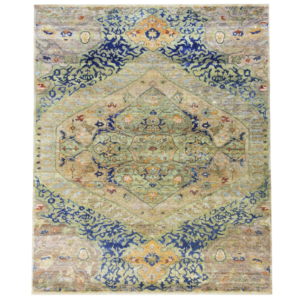 A traditional pattern influenced by Samarkand Khotan motifs and sacred geometry emerges from a bright background thanks to an antique wash in this Alchemy Rug. Handmade in India from upcycled silk, this one-of-a-kind rug from our Alchemy collection reimagines iconic vintage motifs in a spectrum of vibrant colors. Soft and shapeshifting, this high-end rug is made luminous by sun power, low-impact dye, and closed-loop water washes, an eco-conscious process signature to our Alchemy collection.