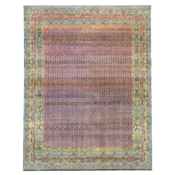 This hand-knotted transitional area rug, measuring 8 feet by 10 feet 6 inches, originates from India. It is crafted from a blend of wool and silk, offering both the durability of wool and the soft, reflective sheen characteristic of silk. The design features a sophisticated palette of purple and pink, which subtly transitions across its central field. The rug's main body displays a low-profile, intricate pattern where the purple and pink hues merge and shift, creating a dynamic visual effect....