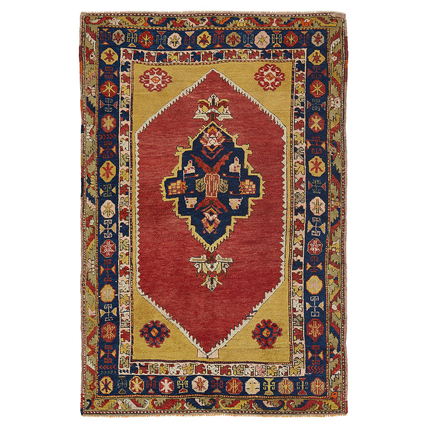 This is a rug that speaks volumes—a storyteller woven in wool. Its very essence is history preserved in texture and pattern. Measuring 4'1" by 6'2", this Turkish marvel is not just a rug; it's a lasting testament to the artistry of traditional craftsmanship. Picture a deep madder red field, as inviting as a fireplace glow, setting a canvas for the story to unfold. From the heart of the rug emerges a medallion—a layered masterpiece of navy blue and bright gold—that...