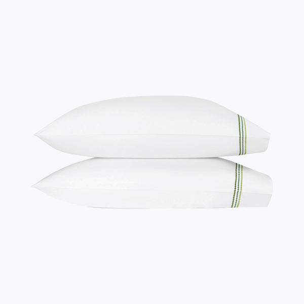 Refresh you sleep space with the Amara Triple Pearl Sateen Pillowcases by Matouk. This refined set is crafted in lustrous 300 t.c. cotton sateen and detailed with a trio of embroidered strands in a tonal palette. Style with the Amara Triple Pearl Sateen Duvet Cover. Choose from Hazy Pool, Palm Green, and Paradise. Available in Standard and King.