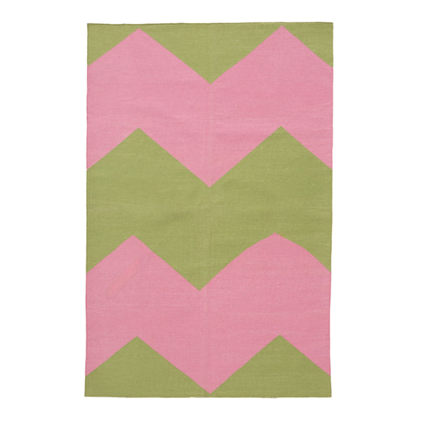 The Green & Pink Chevron Flatweave Cotton Rug - 3'6" x 5'6" is a hand-woven masterpiece from India. The vibrant pink and muted green zigzag pattern creates a modern, geometric design. This high-quality Flatweave rug is made of cotton, adding a pop of color and style to any interior space.