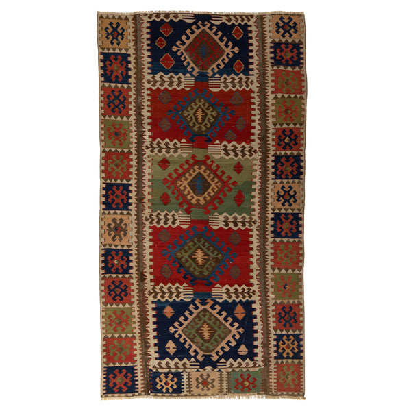 A kaleidoscope underfoot, this Multicolored Flatweave Wool Rug from Turkey spins a story of ancestral craftsmanship and purposeful design. At 4'9" by 9'3", it dances through spaces with the grace of a seasoned linguist, speaking fluently in the dialects of dining rooms, hallways, and bedrooms alike. It's not just a rug—it's resilience woven in wool, soft yet strong, ready to warm your feet and cushion your daily march. A flatweave kilim without a pile, it has the nimbleness of a...