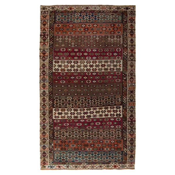 This hand-woven flatweave wool rug, measuring 6'5" wide and 10'9" long, is a canvas where tradition dances with vibrant modernity. Born in Italy, this Kilim-style masterpiece flaunts deep reds, warm terracotta oranges, earthy browns, creamy off-whites, and bold accents of dark blue and charcoal. Each color meanders through intricate geometric patterns—repeating diamonds, zigzags, and stylized motifs—flowing seamlessly across its expanse. Crafted from pure wool, this rug is built to brave daily footsteps, ideal for lively living rooms or spacious dining...