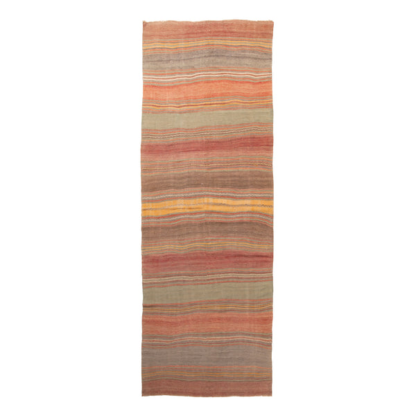 The multicolored stripe vintage flatweave Anatolian wool runner is a masterclass in hand-woven artistry, measuring an exacting 4 feet 9 inches wide by an impressive 14 feet 7 inches long. It's crafted in Turkey, a place where every thread tells a story. Bold and earthy, the runner’s stripes weave narratives of warm terracotta, sage green, deep maroon, and the comforting embrace of browns and taupes. Threads of cream and golden ochre snake through the pattern, effortlessly joining the chorus of...
