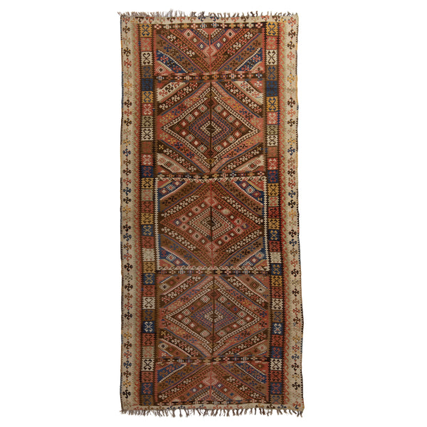 A hand-knotted wool runner measuring 5'7" x 13'2" transforms a long corridor into a canvas of Turkish artistry. Crafted with durable wool, its rich texture carries warmth and resilience, designed to endure daily footsteps while offering visual splendor. The palette brings together warm rusts, deep browns, and earthy terracottas, punctuated by hints of muted blues, soft creams, and golden tones, artfully woven into a harmonious tapestry. Revel in the elegance of its design: a series of prominent diamond motifs extend...
