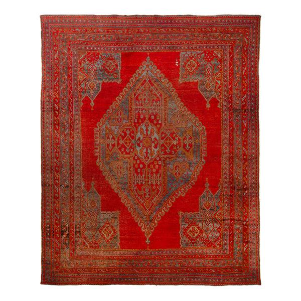 This rug doesn't just lie on the floor; it commands the room with its bold presence. It's not merely a home accessory; it's a statement. Imagine a massive 13'6" x 16'2" tapestry of rich history unfolding across your living room. A field of red dominates the landscape, each thread in its natural, softened shade, exuding an understated elegance that's only possible through time's gentle touch. In this Vintage Oushak Wool Rug from Turkey, tradition speaks through a large-scale central medallion,...