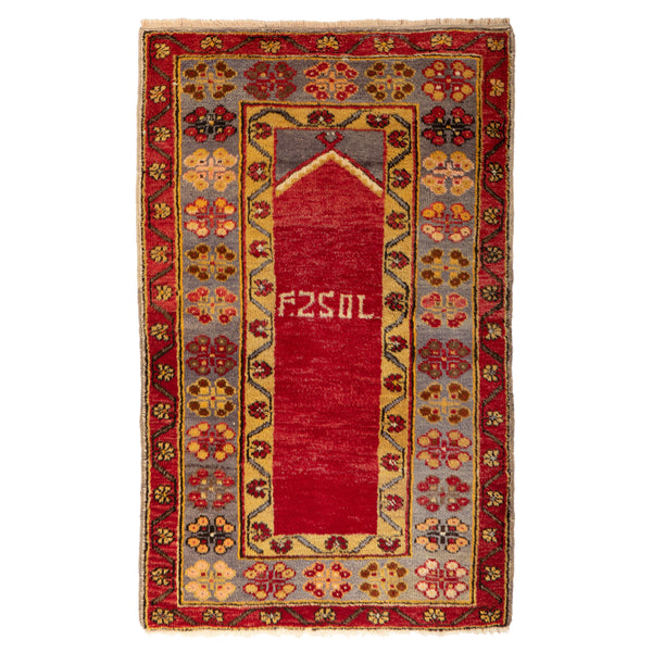 Featuring a traditional prayer rug design surrounded by floral patterns in a vibrant color palette of red, yellow, and blue, this Anatolian Wool Prayer Rug - 2'8" x 4'7" is a work of art with its organic depth and natural texture. This antique flatweave rug is crafted in the traditional Anatolian style of weaving with naturally dyed, durable wool. An heirloom-worthy piece, this traditional kilim prayer rug is an effortless way to introduce ancient motifs, rich colors, and storied wisdom...