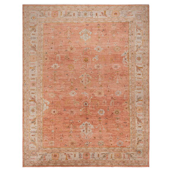 This hand-knotted Oushak rug, originating from Turkey, features a distinct orange hue and is crafted from luxurious Angora wool. Measuring an expansive 11'6" by 14'9", it provides substantial coverage for large living spaces. The rug's field showcases a soft, earthy orange, resembling a salmon or terracotta tone, which is subtly variegated, adding depth and visual interest. Its traditional Oushak design includes an all-over pattern of stylized floral motifs and delicate vine work. These intricate details are rendered in complementary shades...