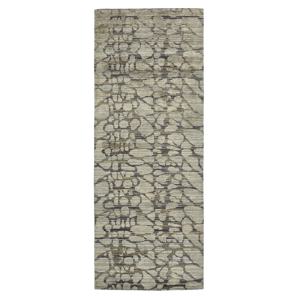 The elegance of modern design finds its footing in a runner—a contemporary grey masterpiece born from the skilled hands of artisans in India. This isn't just a rug; it's an experience, a tactile symphony of natural wool interwoven with the fine silk threads that shimmer subtly underfoot. What captivates is its design—a dance of abstract forms and winding lines in shades of grey and charcoal. Each organic, pebble-like motif and intersecting line weaves a narrative that whispers sophistication without shouting...