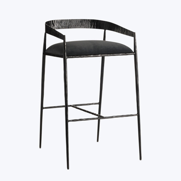 Sharp angles meet dramatic curves in the Ansel Barstool by Arteriors. Featuring a hammered iron frame and smooth performance velvet cushioning, this striking barstool is a study in contrasting textures. An elevated piece, perfect for industrial and moody, contemporary spaces. Available in Midnight Gray and Sterling.