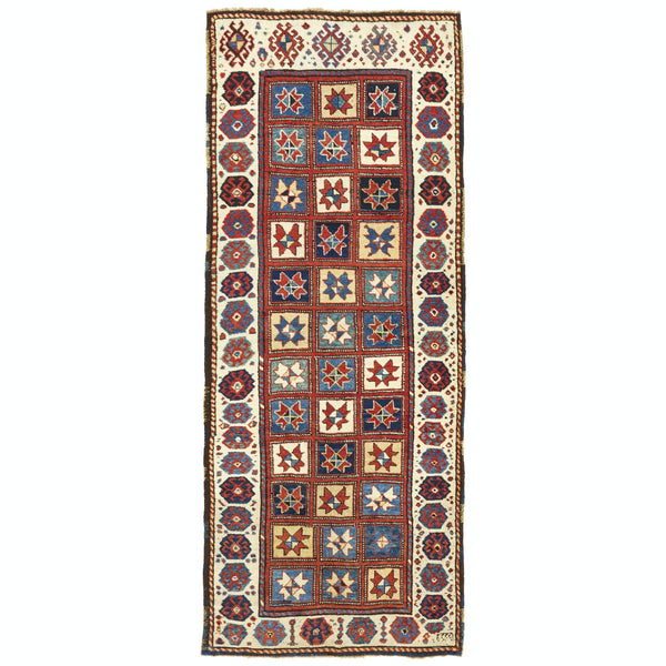 Handwoven from wool in Russia, this antique Kazak rug features stars of wisdom, symbolic representations of luck and spirituality, in an intriguing compartment-style format. Scorpion motifs, symbols thought to ward off evil intent, fill the narrow ivory border. Traditionally inspired by the Caucasian designs found in carpets from Russian and the northern Persian empire, antique Kazak rugs incorporated a distinctive tribal flavor.