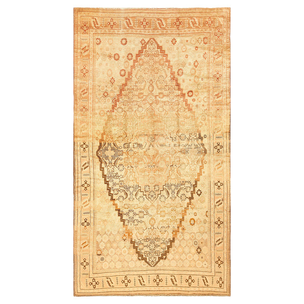 The Brown Antique Traditional Khotan Rug - 7' x 12'7" is a hand-knotted masterpiece from Iran. Featuring shades of blue, beige, and ivory in a symmetrical, intricate design, this traditional rug showcases a central field with medallion shapes connected by detailed borders. The high quality wool construction highlights the craftsmanship and value of this exquisite piece.