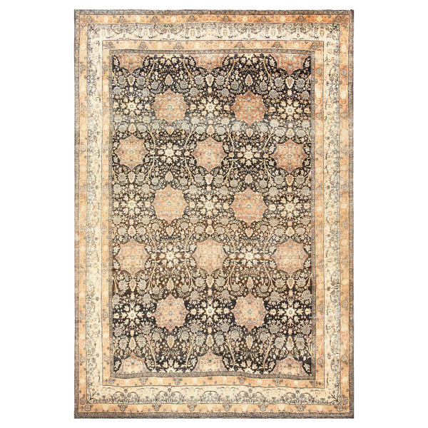 The Black & Gold Antique Traditional Persian Kerman rug is a masterpiece of intricate design. Featuring a symmetrical pattern of floral and geometric motifs in dark tones with contrasting lighter shades, this hand-knotted wool rug exudes elegance. The lattice structure and detailed borders showcase the skilled craftsmanship of this high-quality, statement piece. Made in Iran, measuring 9'9" x 14'6".